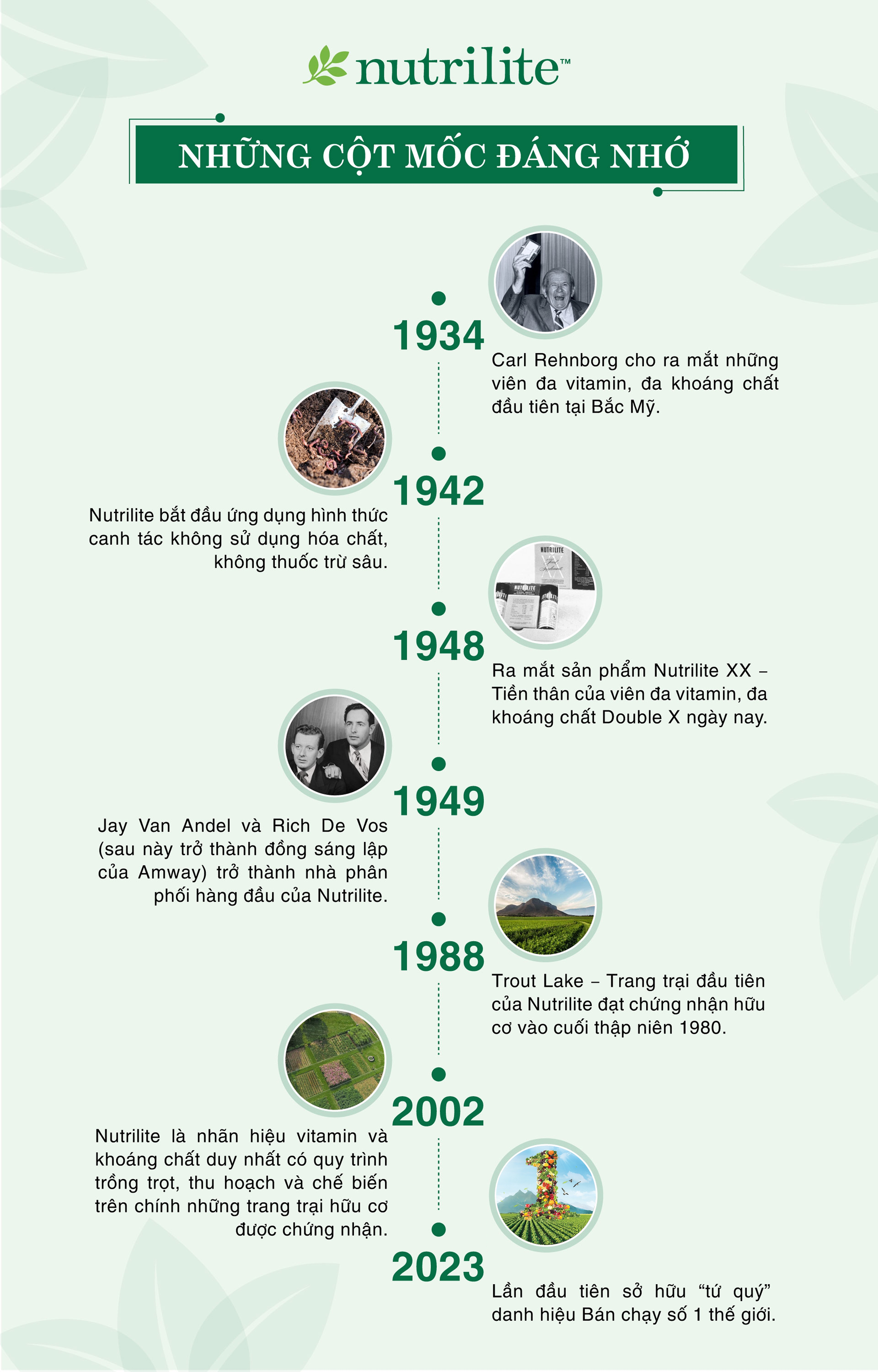 Từ năm 1934, Nutrilite đã tiên phong nghiên cứu về vai trò của dưỡng chất thực vật với sức khỏe, và giới thiệu những viên vitamin đầu tiên trên thế giới. Cũng từ đây, chúng tôi không ngừng kết hợp sức mạnh của thiên nhiên, ứng dụng khoa học đổi mới, và theo đuổi các giá trị bền vững nhằm hỗ trợ hàng tỷ khách hàng sống khỏe chủ động hiệu quả hơn 90 năm qua.
